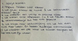 Een belangrijk uitgangspunt in de training is dat vreedzaam samenleven begint bij jezelf. Daarom startten de deelnemers met iets dat eenvoudig lijkt, maar veel betekenis heeft: samen afspraken maken over hoe je met elkaar omgaat. Hoe luisteren we naar elkaar? Hoe zorgen we dat iedereen zich gezien en gehoord voelt? De groep formuleerde samen: zo doen we het hier.