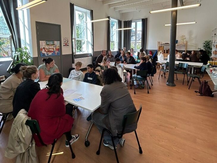 Dit is een mooi voorbeeld uit de gesprekken die diverse wijkpartners hebben gevoerd met de kinderen van de Bavokring, de Kralingsche School en Melanchthon Kralingen in Rotterdam. Het thema van de Vreedzame Wijklunch was dit keer: jeugdparticipatie. Als volwassenen praten we te vaak over de jeugd — over wat er beter kan, wat zij nodig hebben of missen — maar doen dat meestal zonder de jeugd zelf. Terwijl juist zíj natuurlijk de echte experts zijn. Zij weten het beste wat ze willen, wat werkt en wat niet. Daarom hebben we ervoor gekozen om de jeugd zelf uit te nodigen en actief te betrekken bij deze Wijklunch. Van de Bavokring waren Anouar en Zayneb aanwezig. Van de Kralingsche School deden Loes, David, Mink, Stefan, Maxime, Charlotte, Lotte, Sofia, Joep, Bob en Charlotte mee. Van Melanchthon Kralingen namen Callista en Somaya deel. De kinderen hadden het gesprek voorbereid en zelf vragen bedacht voor de volwassenen als handvat. Dit werd een tafelkaart. Samen met volwassenen gingen zij het gesprek aan over jeugdparticipatie. Elke tafel bestond uit een mix van volwassenen en jongeren. Met behulp van een tafelkaart vol gespreksvragen werd het gesprek op gang gebracht. Op de tafelkaarten stonden onder andere de volgende vragen: